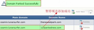 3、接下来选择暂停域所在的域(本文以cosmin.lunarsurfer.com域名为例),然后在Parked Domain右边方框中输入添加的暂停域域名(本文以123parkednew为例),具体设置如下图:
